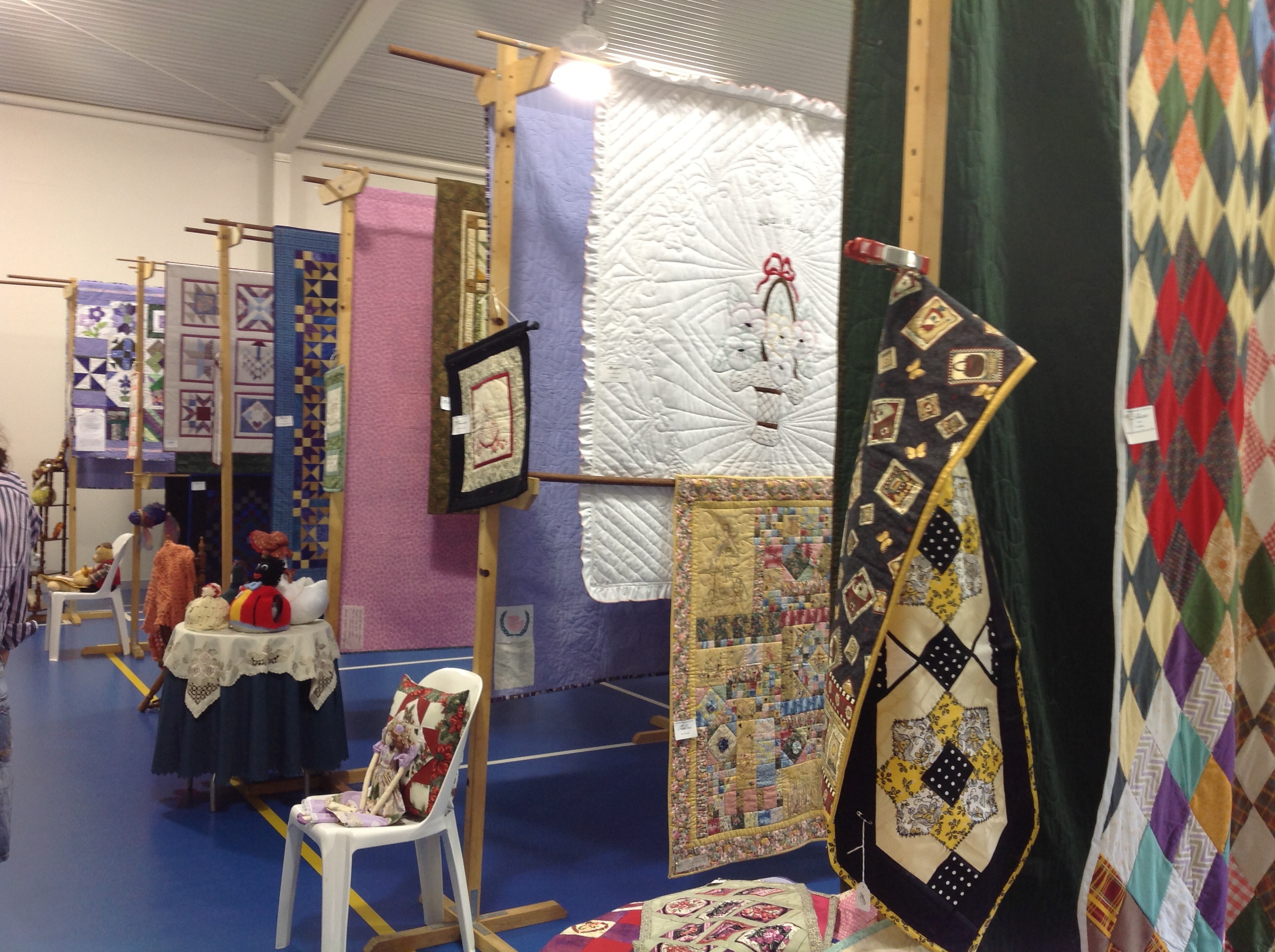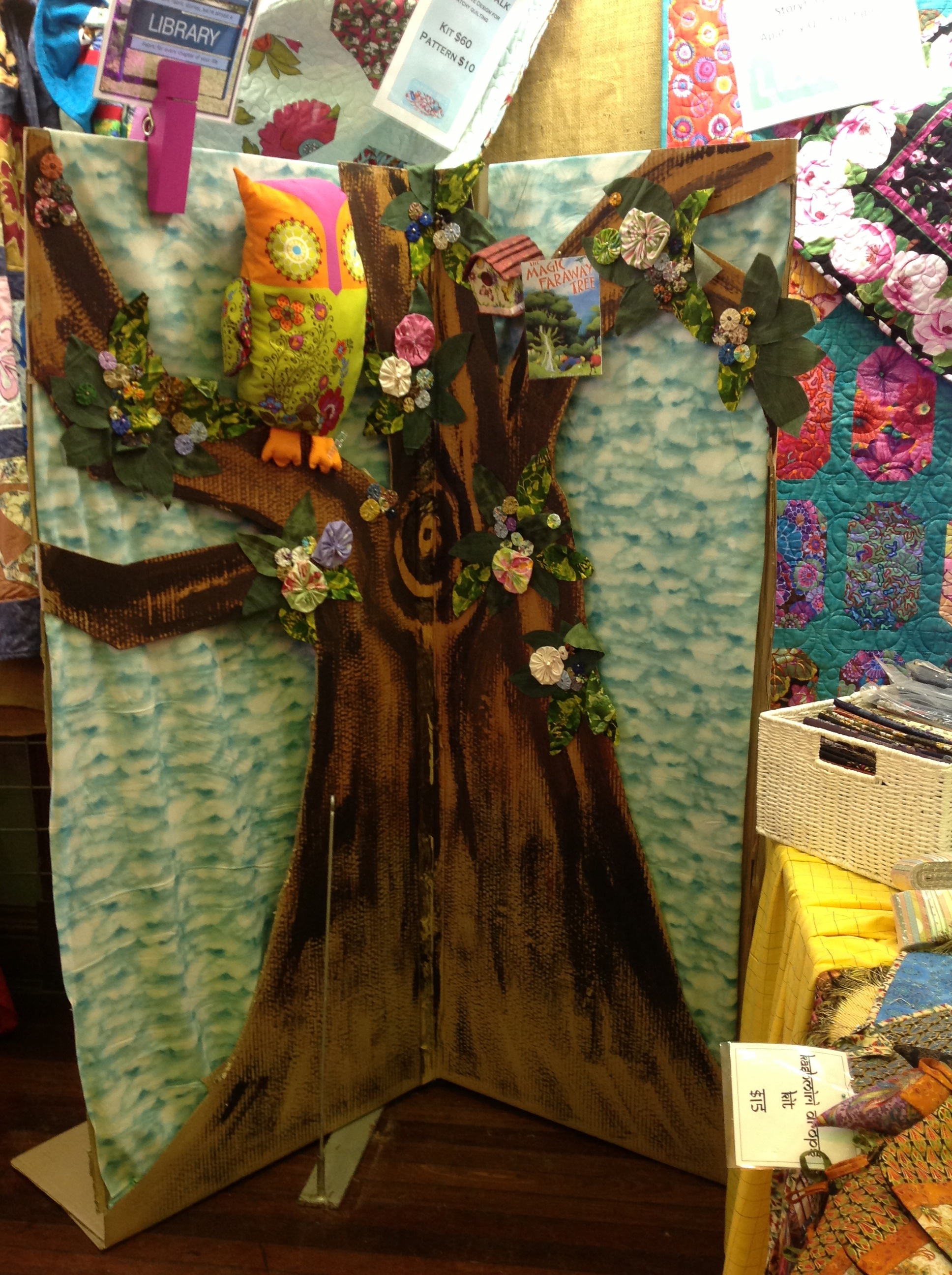 Yay! Today we won the prize for the best decorated stall at the Maryborough Quilt Show. This was thanks in no small part to Lesa the Leonardo da Vinci of tree painters, Jan and others who helped with the ideas and the work of creating this display. We had several people taking photos of the tree during the day. In fact Cameron the president of the Rotary Club was challenged into making the owl that we had in the tree. I have included a photo of him -he looks a little worried doesn’t he?