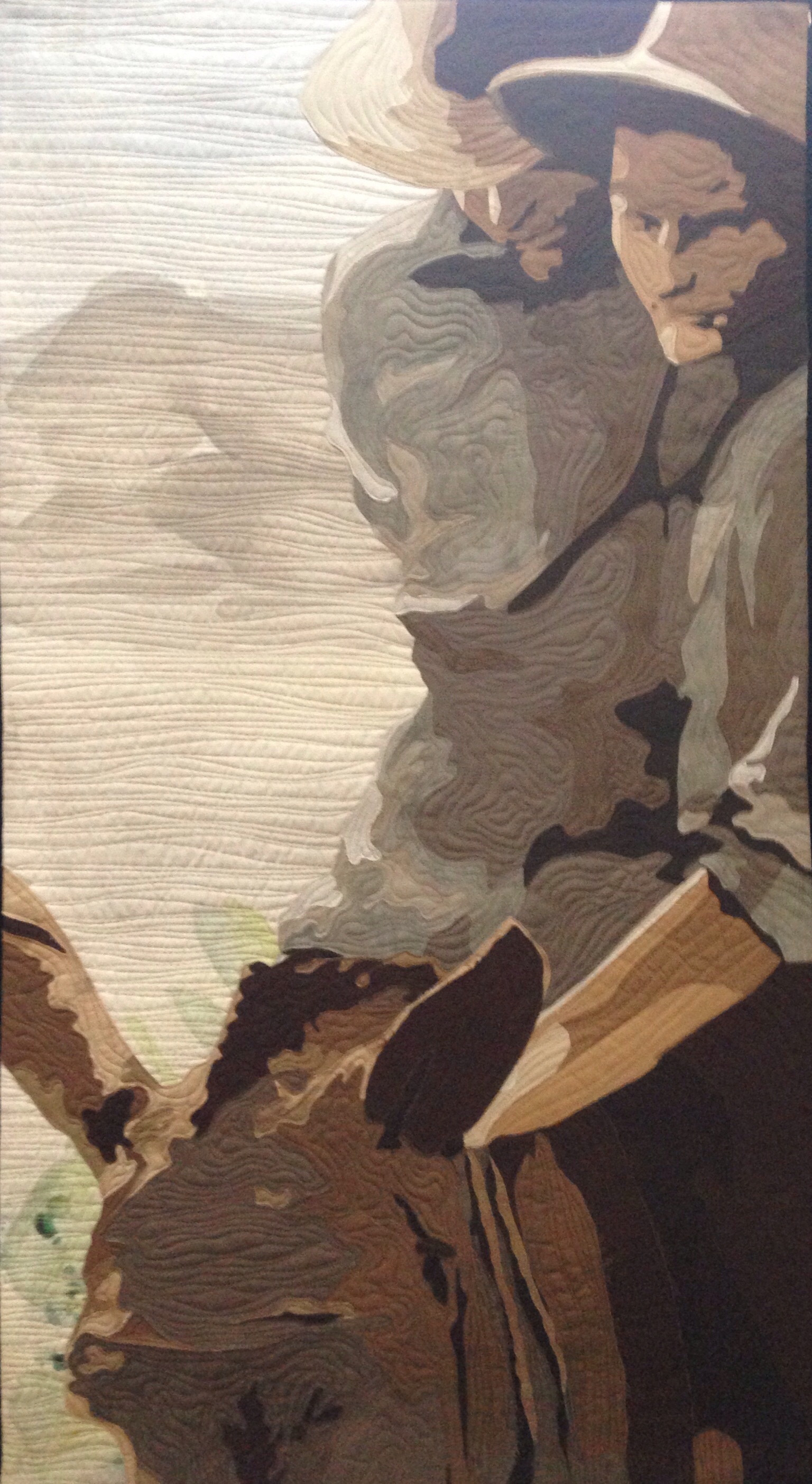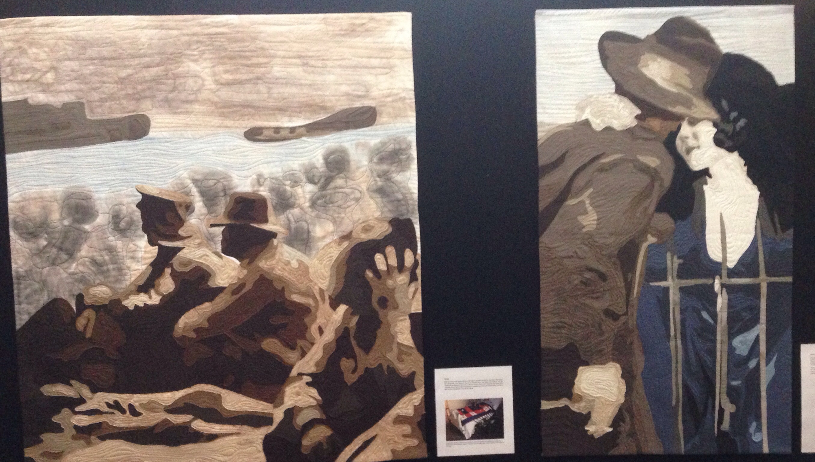 The Apatcheez were very busy this week and several projects were begun after the finishes of the past two weeks. That means that I don’t have any finished quilts to show you. What I can show you are parts of ‘The Gallipoli Quilt’ by Lucy Carroll. Lucy was the guest artist at the recent Melbourne quilt convention. She is a veteran of the RAAF so has combined her love of quilting with personal experience to create an impressive 12 metre long artwork. The quilt is actually made up of ten panels, each one illustrating an aspect of an Australian soldier’s life from his dockside departure to his arrival at Gallipoli Cove.