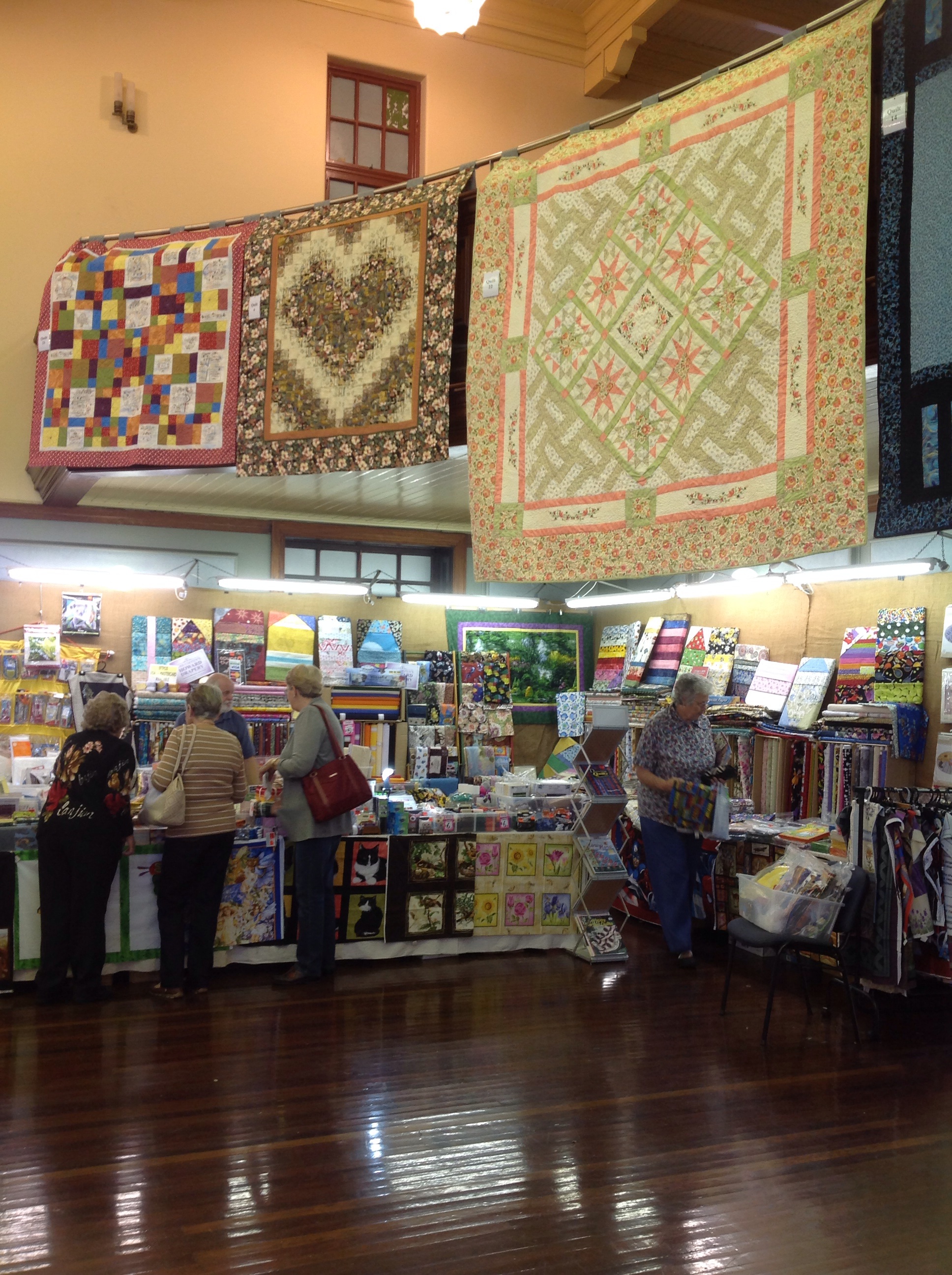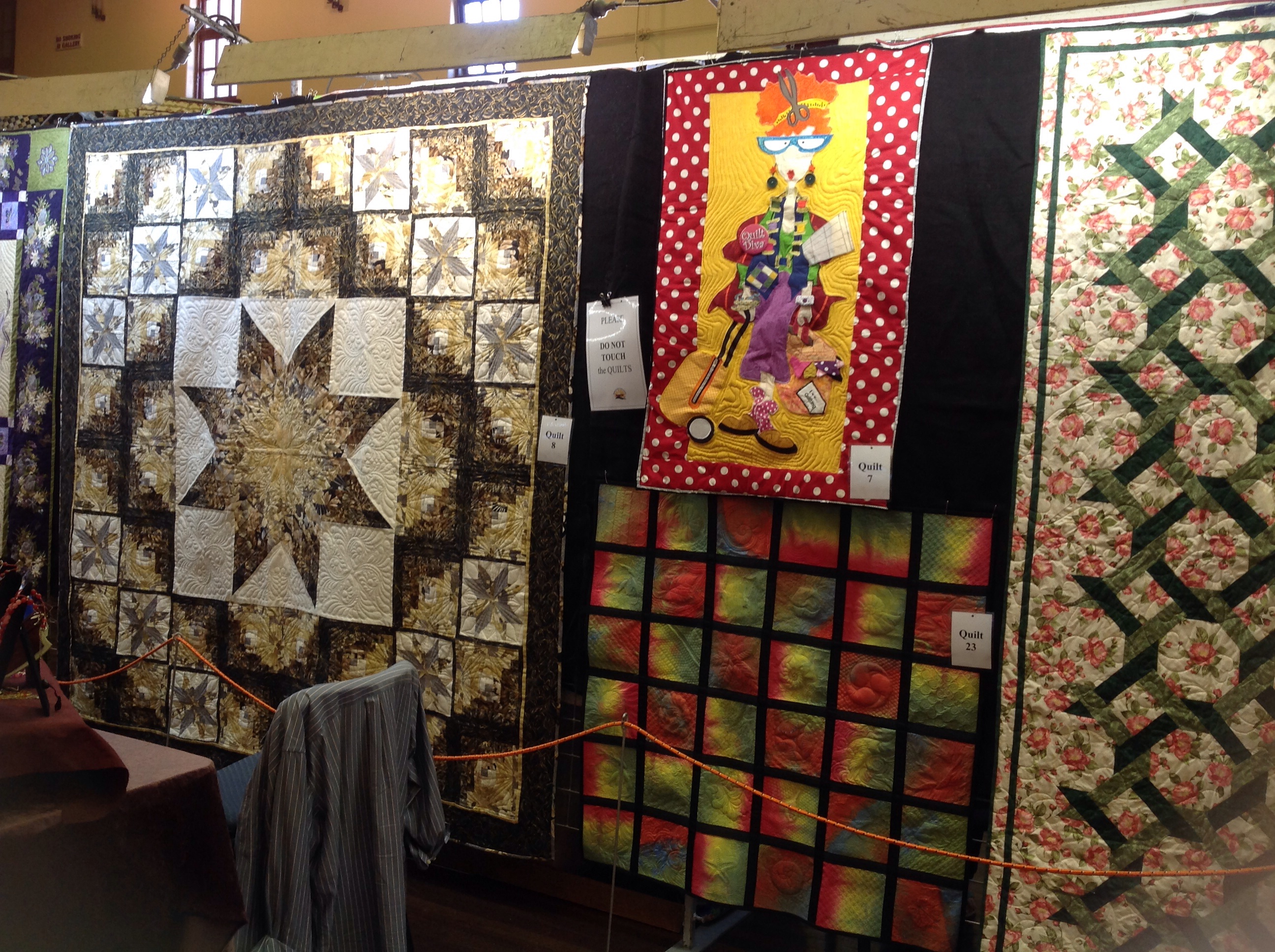 It was difficult to get photos of the quilts on display because they were either behind a stall or hanging from the balcony in the Town Hall. Here’s what we saw: