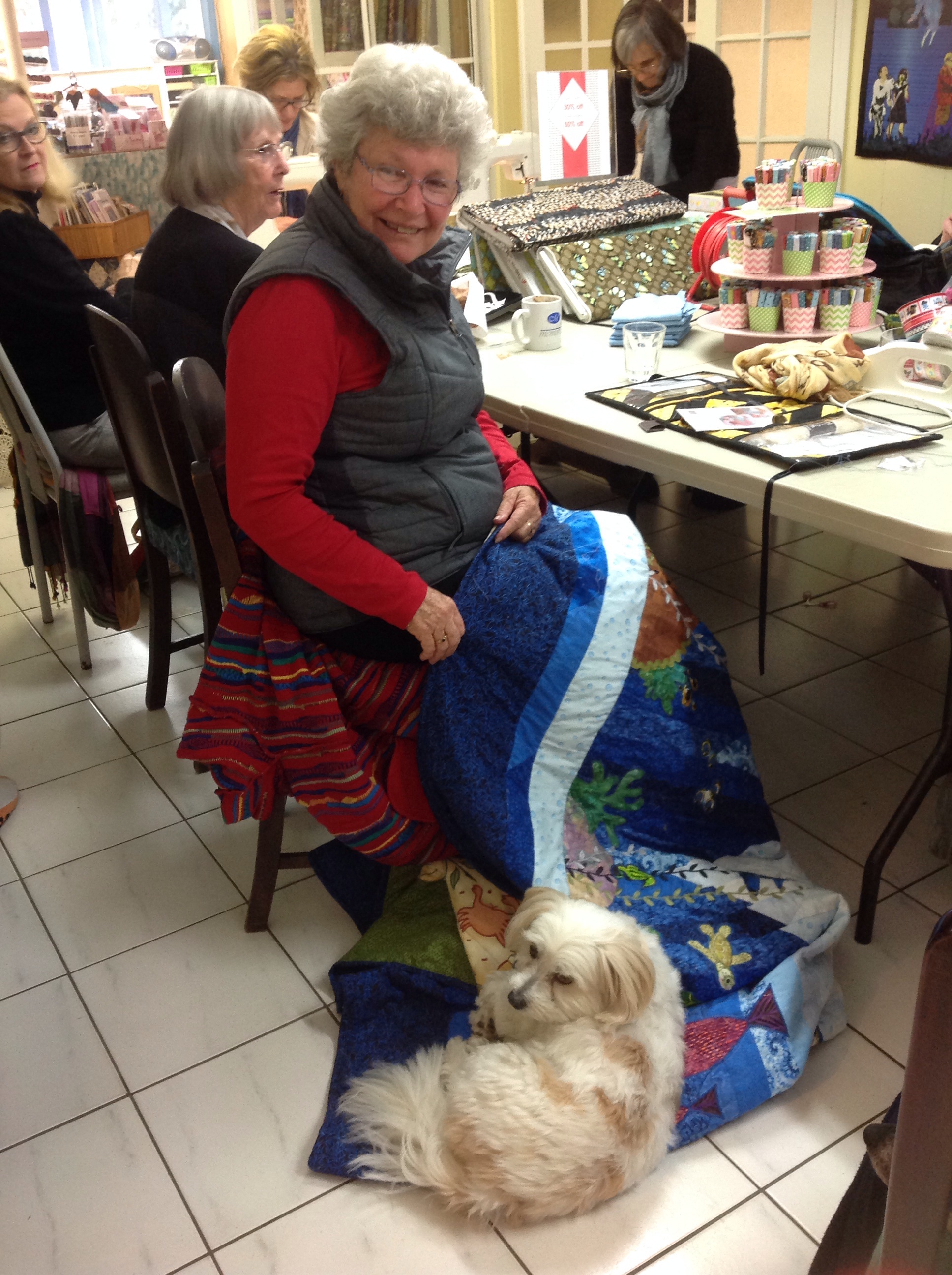 Margaret was also very busy this week and managed to finish her under-the-sea quilt – and very nice it was too. It has been a bit chilly here over the past week and Charlie took advantage of the fact that he didn’t have to sit on a cold floor for a while.