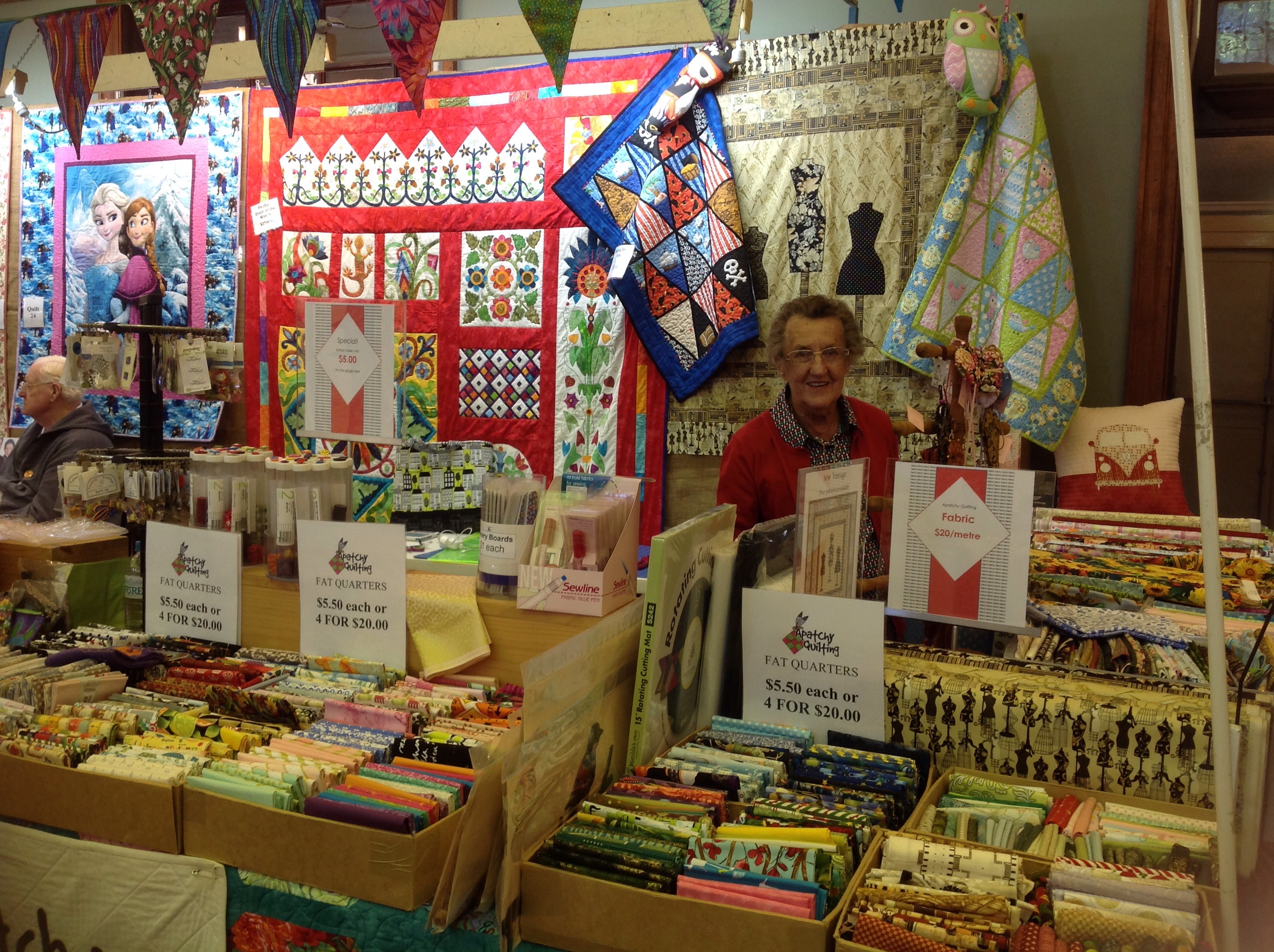 When end we arrived in Maryborough we managed to set our stall up in record time. We put it down to pre-planning and the family effort. Apart from Mum and Dad, Luvvy packed up the Paj to the roof and unpacked it all when we arrived plus the teenager-in-residence helped put up the quilts in the backdrop – very useful having a tall son. Here’s Mum ready for action.