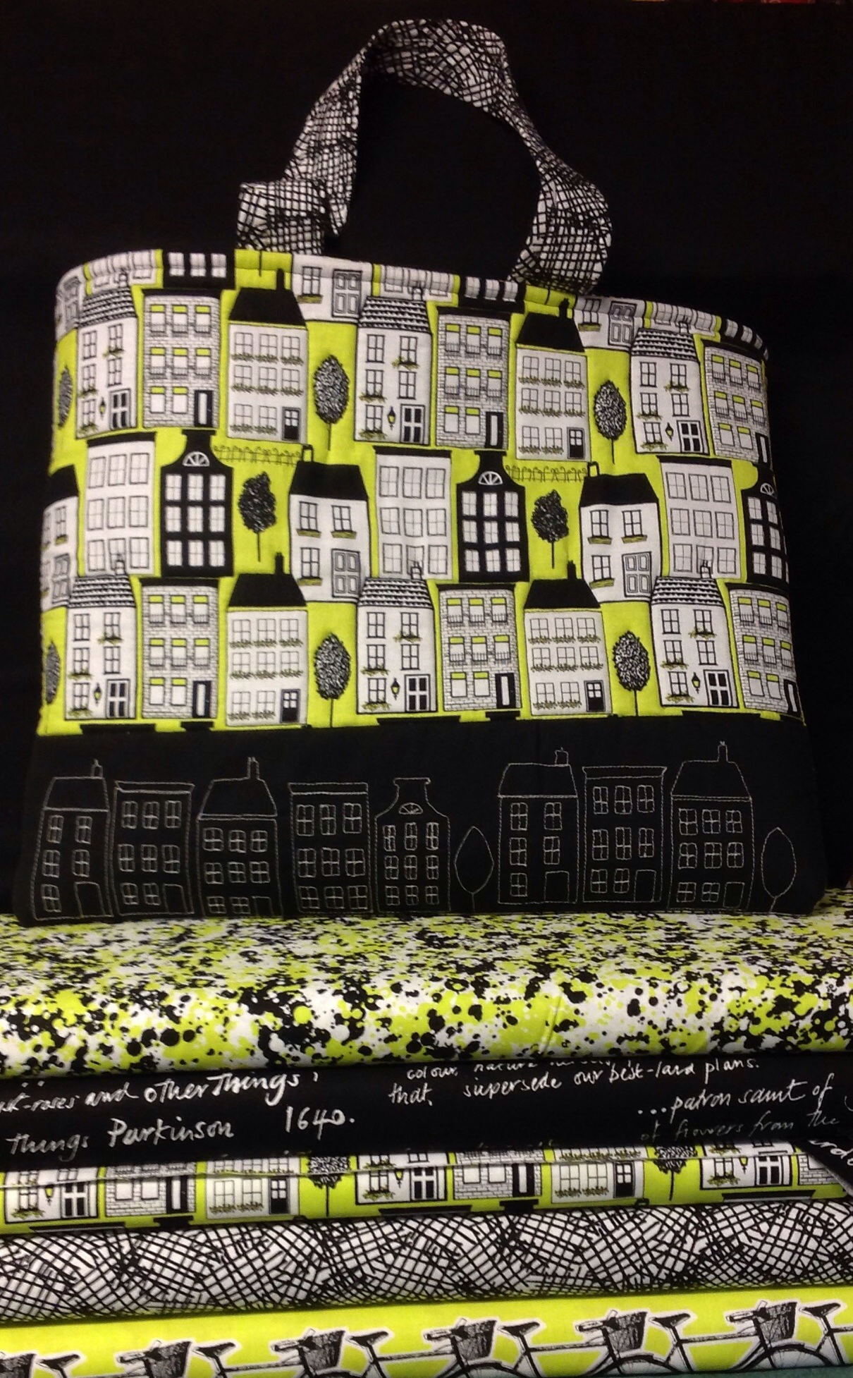Mum helped me put together this tote – inspired by Bec’s suggestion to add quilted houses at the bottom and made out of the “Out of Town” fabric range – one of several ranges recently delivered (that I haven’t had time to photograph – too busy!).