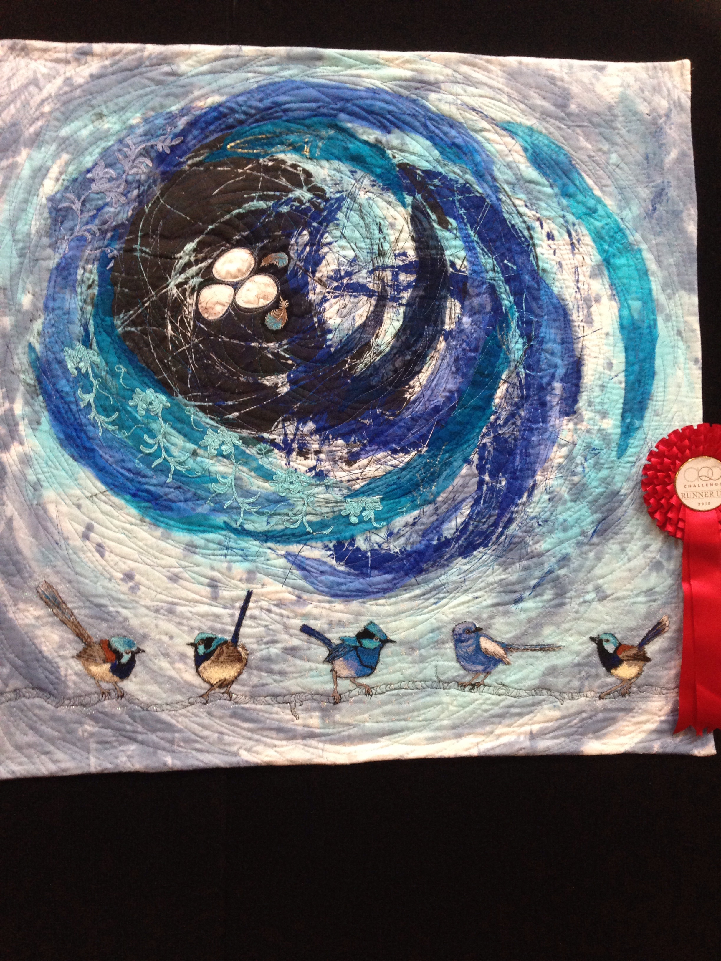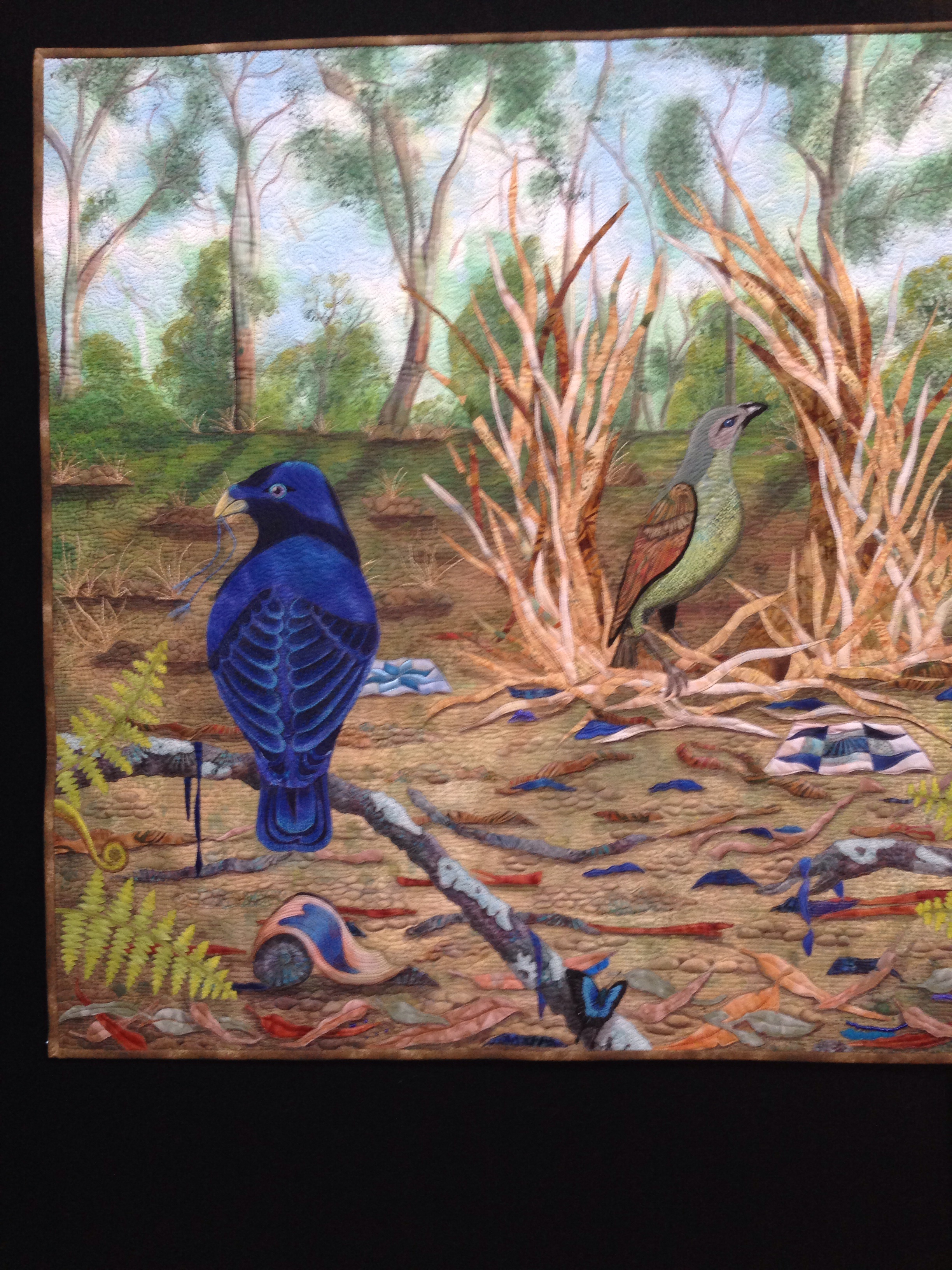 But I digress. The business at hand is the quilt convention and so it was that I made my way up the hill to the Exhibition Building (another architectural masterpiece) to see what architextile masterpieces I could find. And I was not disappointed. I took so many photos that I will have to ration you lest you be overcome. I’ll start today with the ‘True Blue’ entrants for the AQC challenge. Unfortunately I neglected to get all the names of the quilters and their entries and I apologise for that and also for the fact that not all the photos are of the best quality (well the light was bad in some areas and I was working under pressure).